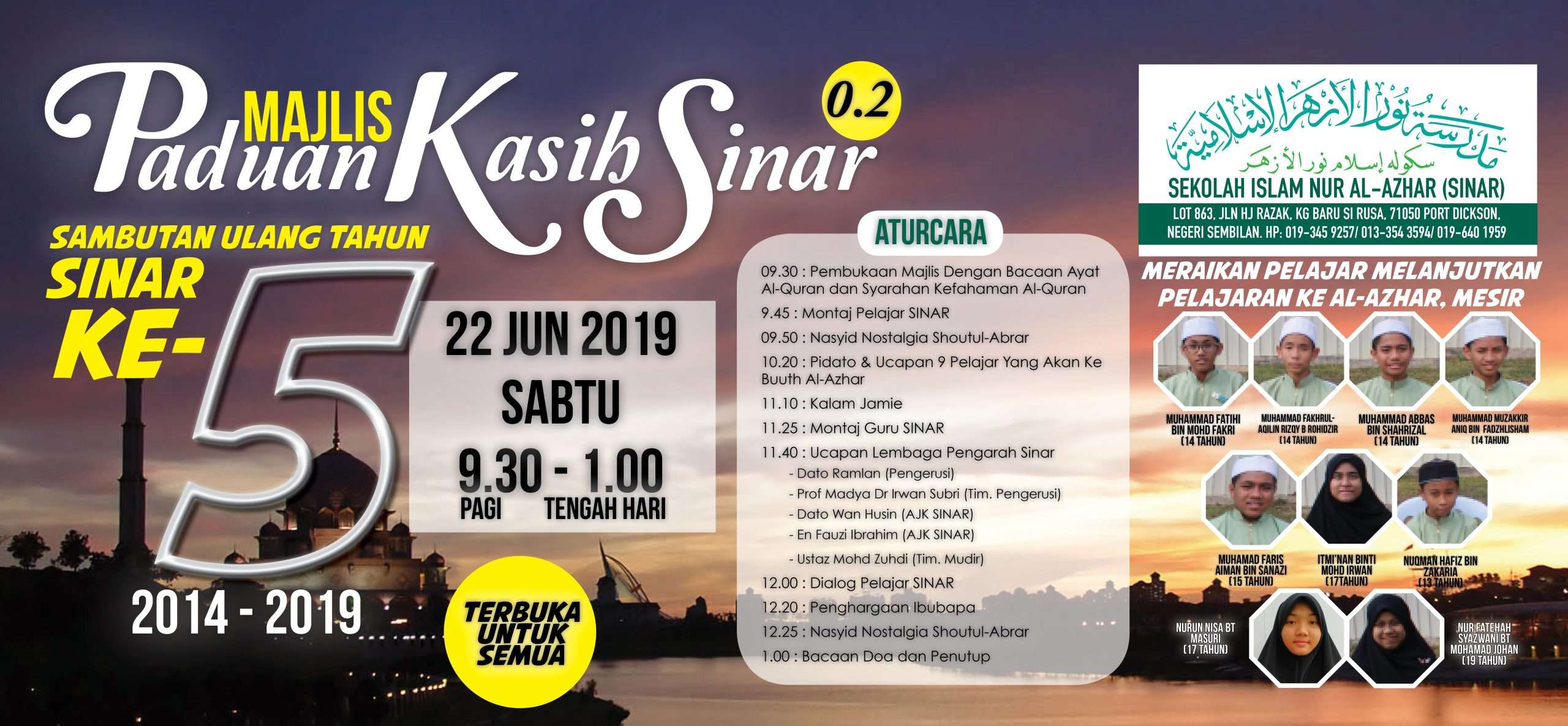 Sekolah Islam Nur al-Azhar (SINAR) telah mengadakan majlis kesyukuran bagi meraikan ulang tahun ke-5 dan keberangkatan 9 pelajar yang akan melanjutkan pelajaran mereka di Buuth al-Azhar, Mesir.