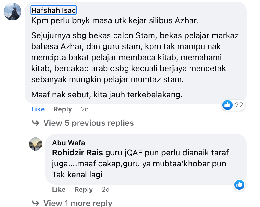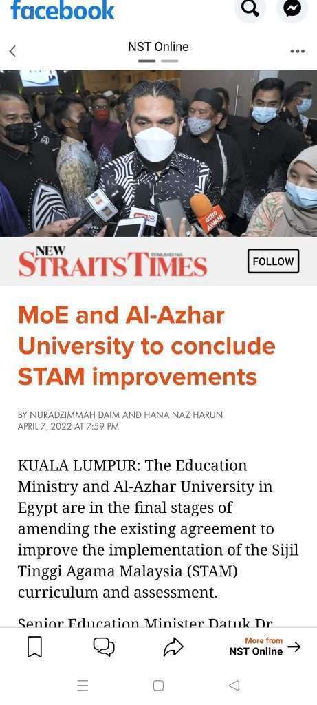 Apakah lepasan STAM lebih mahir bahasa Arab?Kenapa lepasan STAM dengan kelulusan tertinggi Mumtaz tetapi gagal dalam ujian asas Bahasa Arab di Al-Azhar?Sebaliknya kelahiran STAM membunuh banyak sekolah agama/ pondok yang sebelum ini mempunyai muadalah/ MOU terus dengan Al-Azhar.Dan mengapa pula kerajaan Malaysia memerlukan perantara bagi mengadakan MOU dengan Al-Azhar?Mampukah KPM memenuhi kriteria silibus yang ditetapkan oleh al-Azhar?Hasilnya kuantiti dan kualiti pelajar yang dihantar semakin merosot.https://www.nst.com.my/…/moe-and-al-azhar-university…